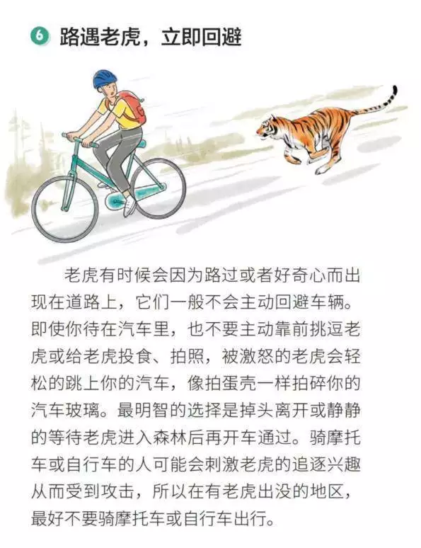 据2024年11月东北虎豹公园官方公众号消息,为了应对人兽冲突问题,东北虎豹公园管理局编撰了《遇到老虎怎么办?》宣传手册,其中指出,老虎有时会因路过或好奇而出现在道路上,它们通常不会主动回避车辆。即便身处车内,也应避免主动靠近挑逗老虎,或向老虎投食、拍照。最安全的做法是掉头离开,或静待老虎进入森林后再行通过。骑摩托车或自行车的人可能会激起老虎的追逐兴趣,从而遭受攻击,因此在老虎出没的地区,应避免骑行。若意外遭遇老虎,切忌扭头逃跑或弯腰低头,与老虎对峙时应保持冷静,尝试转移其注意力。